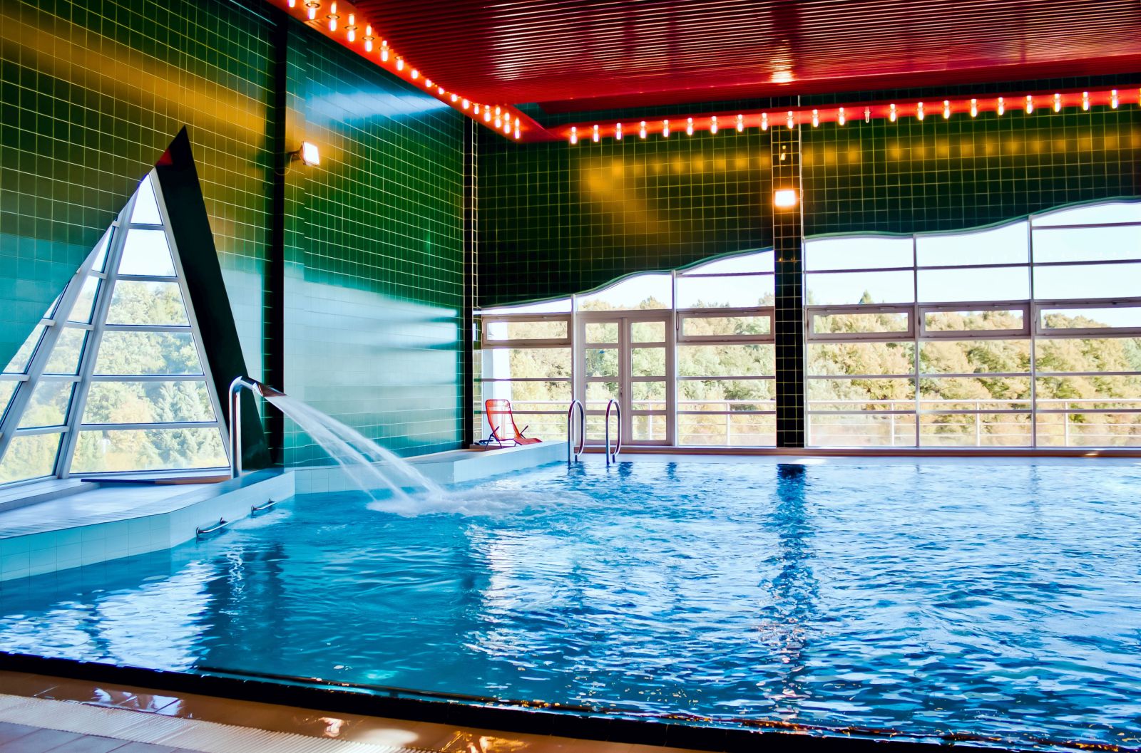 Vnitřní bazén (11,5 x 12,5 m, teplota vody 30 ˚C).