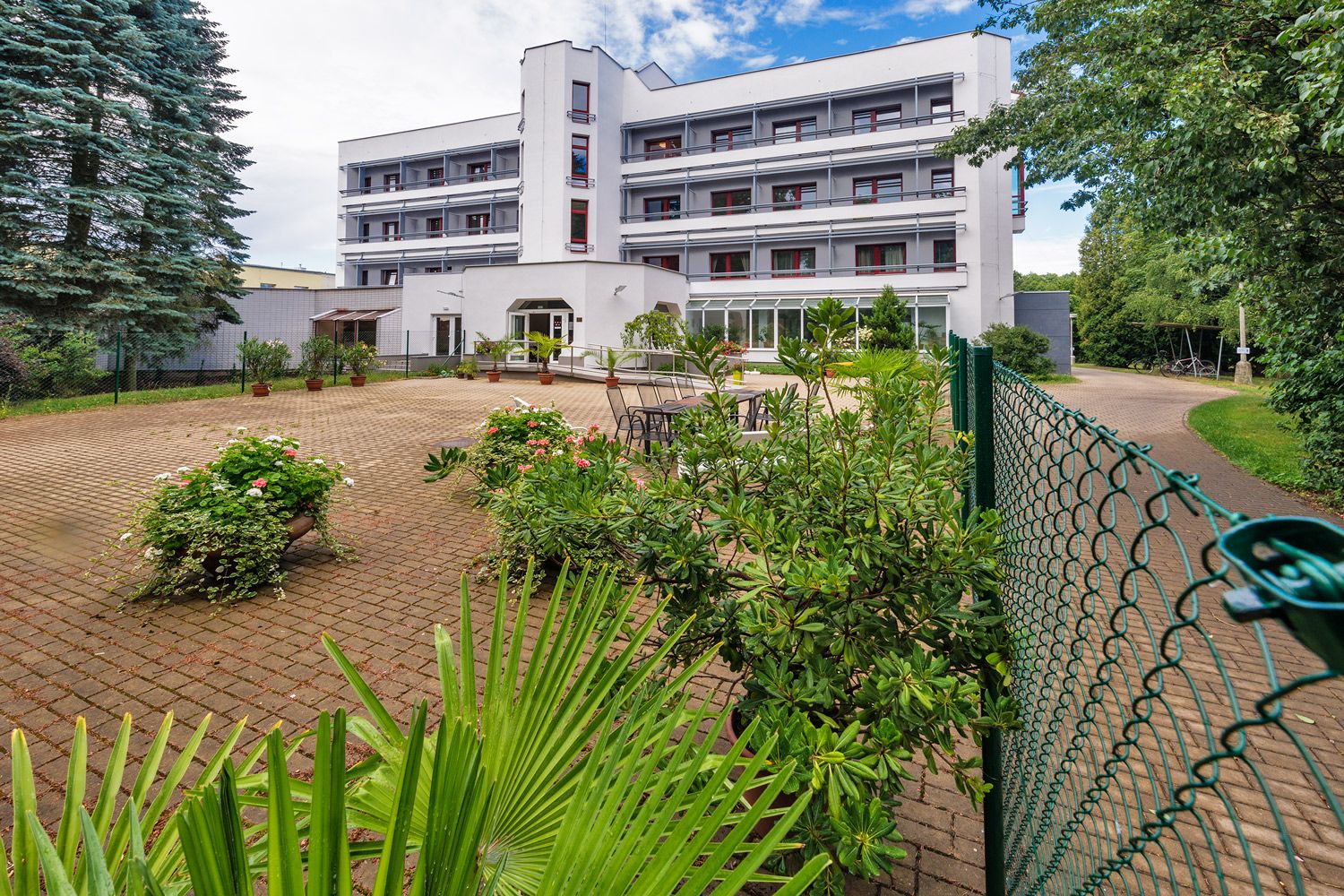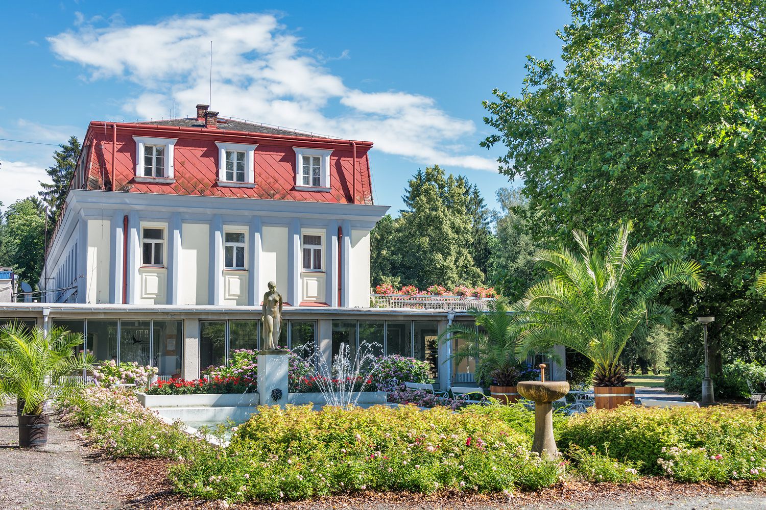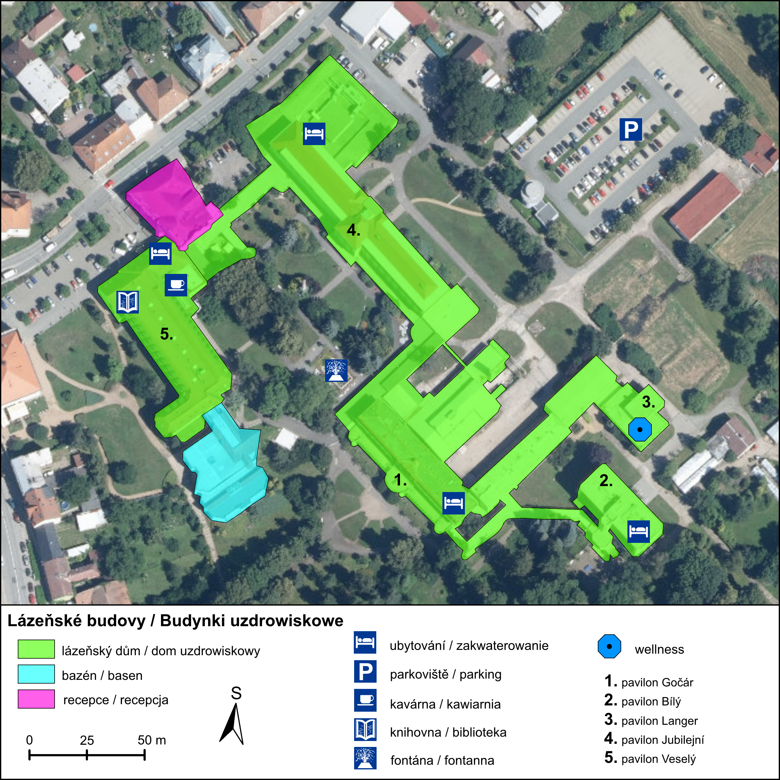 Všechny lázeňské domy jsou spojeny prosklenou kolonádou, která prochází i 62 metrů dlouhým Gočárovým pavilónem.